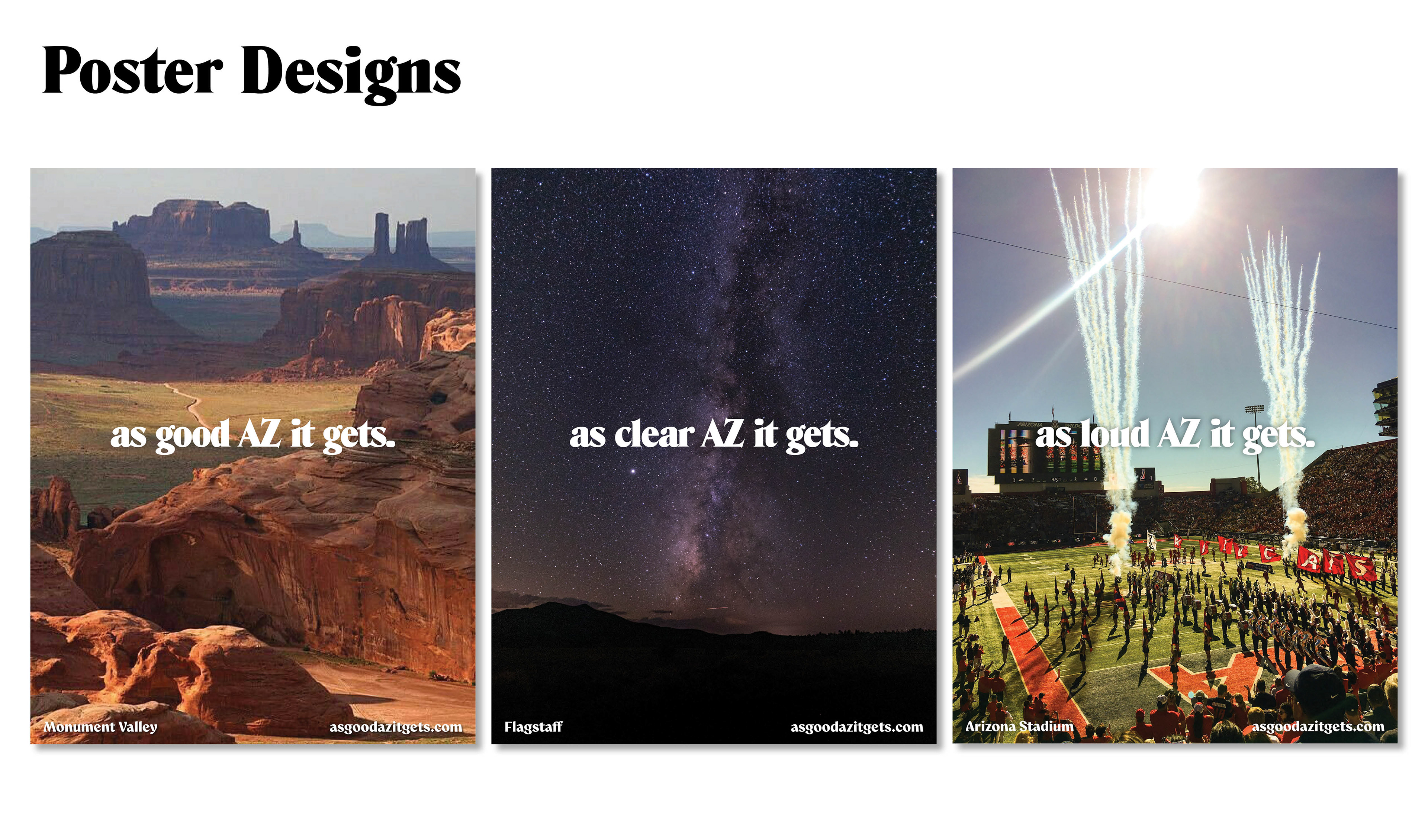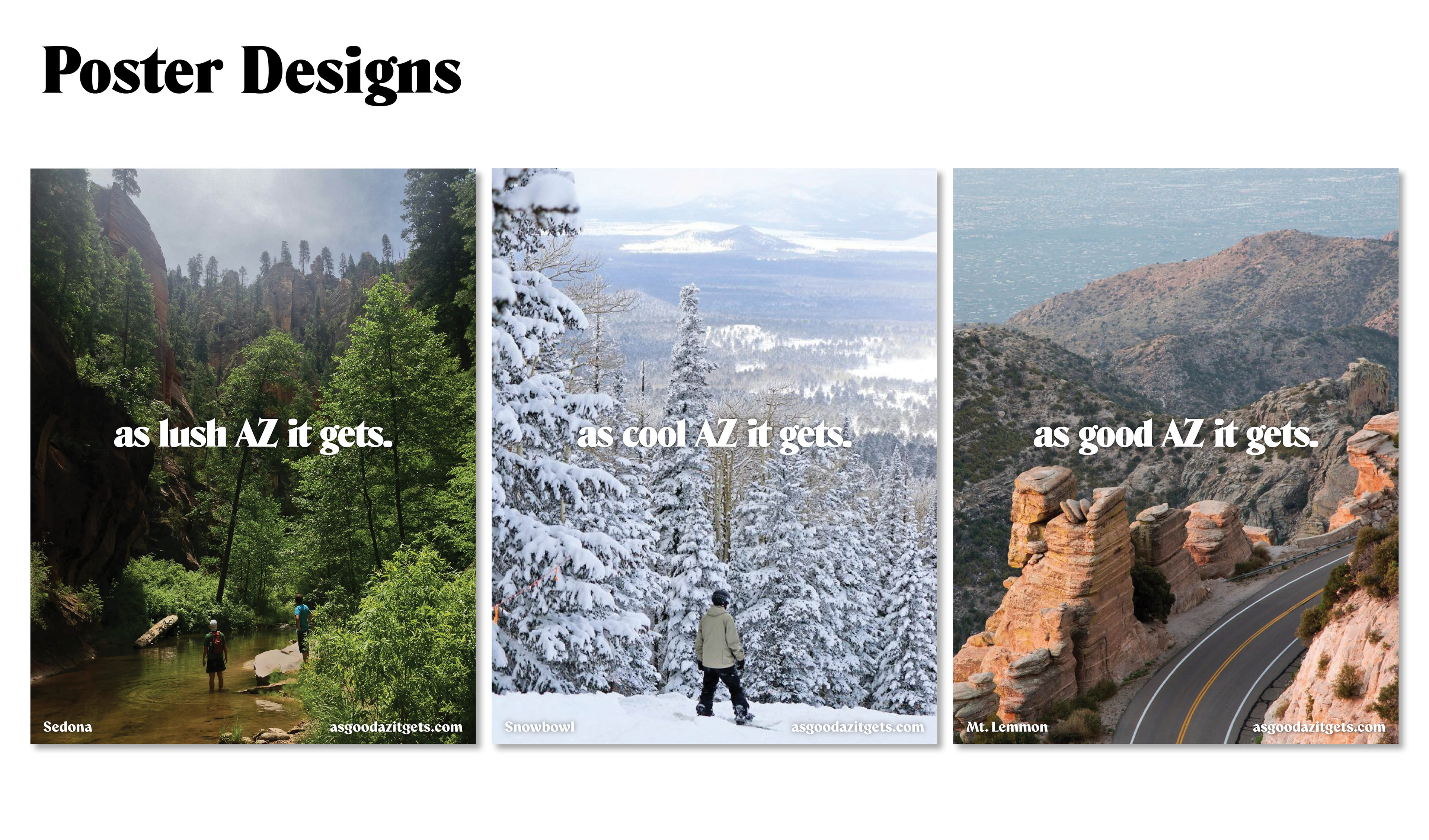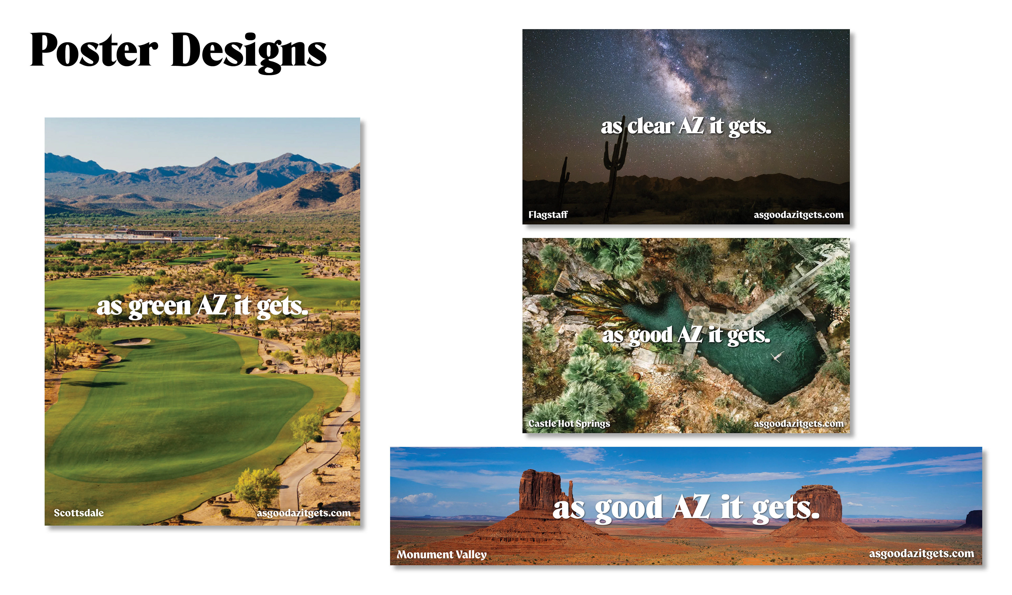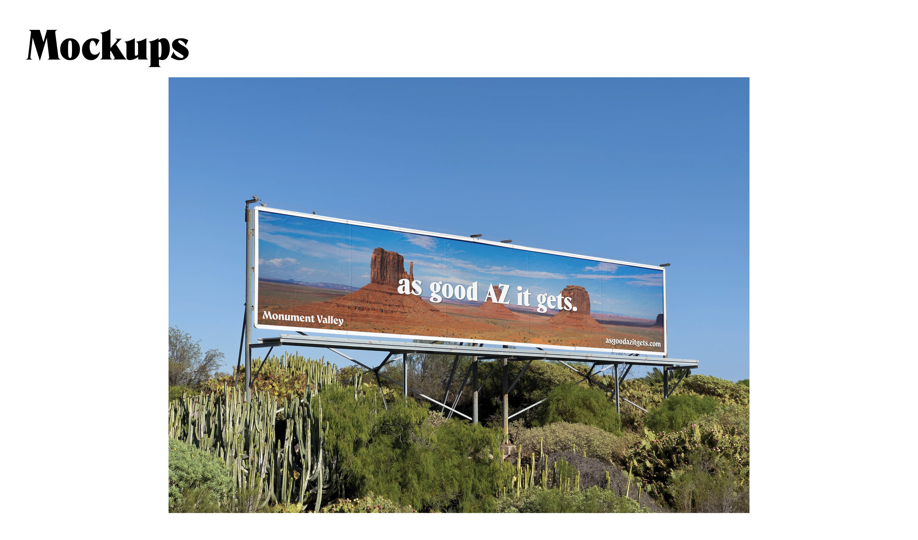 An advertising campaign design to promote tourism to Arizona, using the slogan "As good AZ it gets". I am currently working with this client to continue this design and make it a reality.