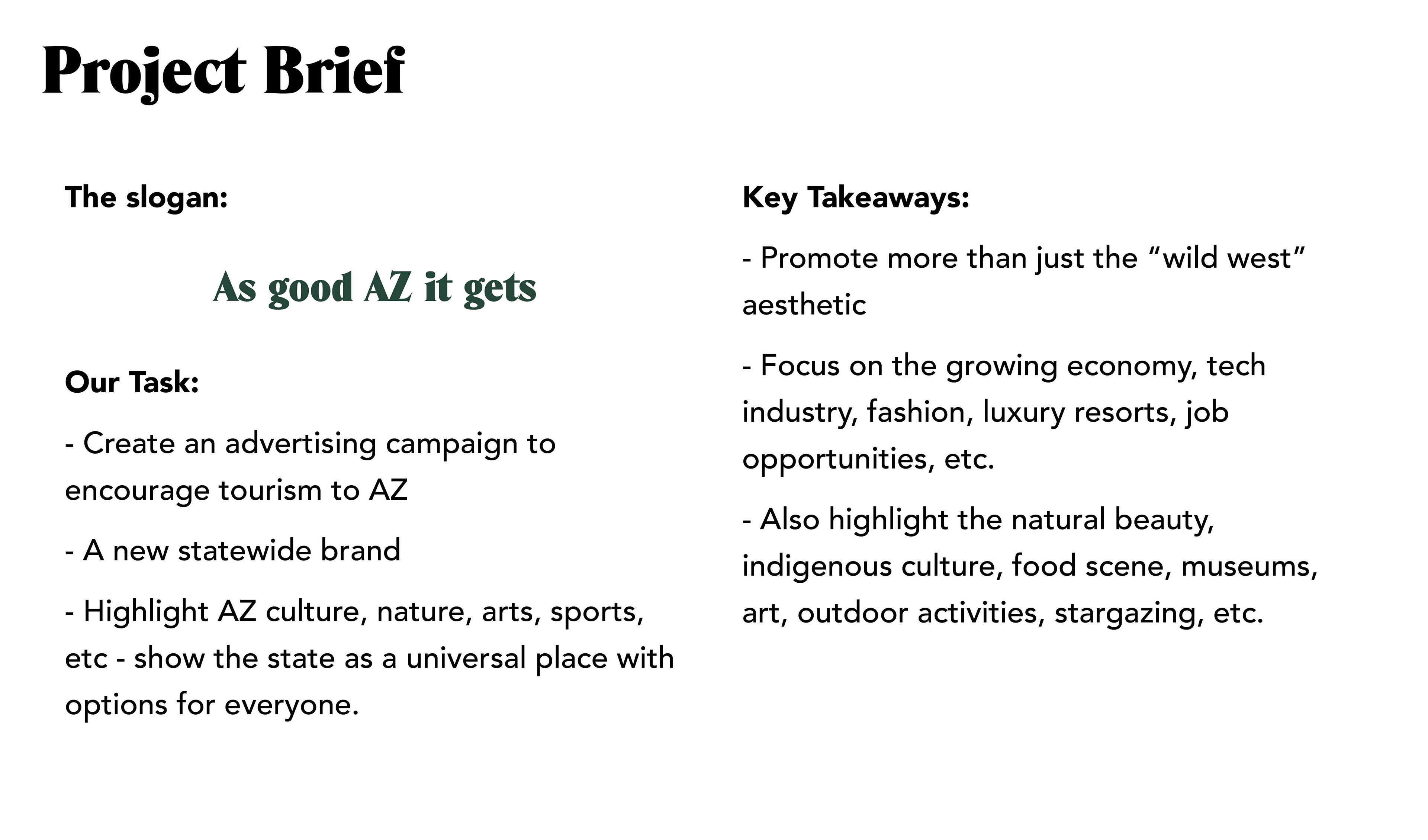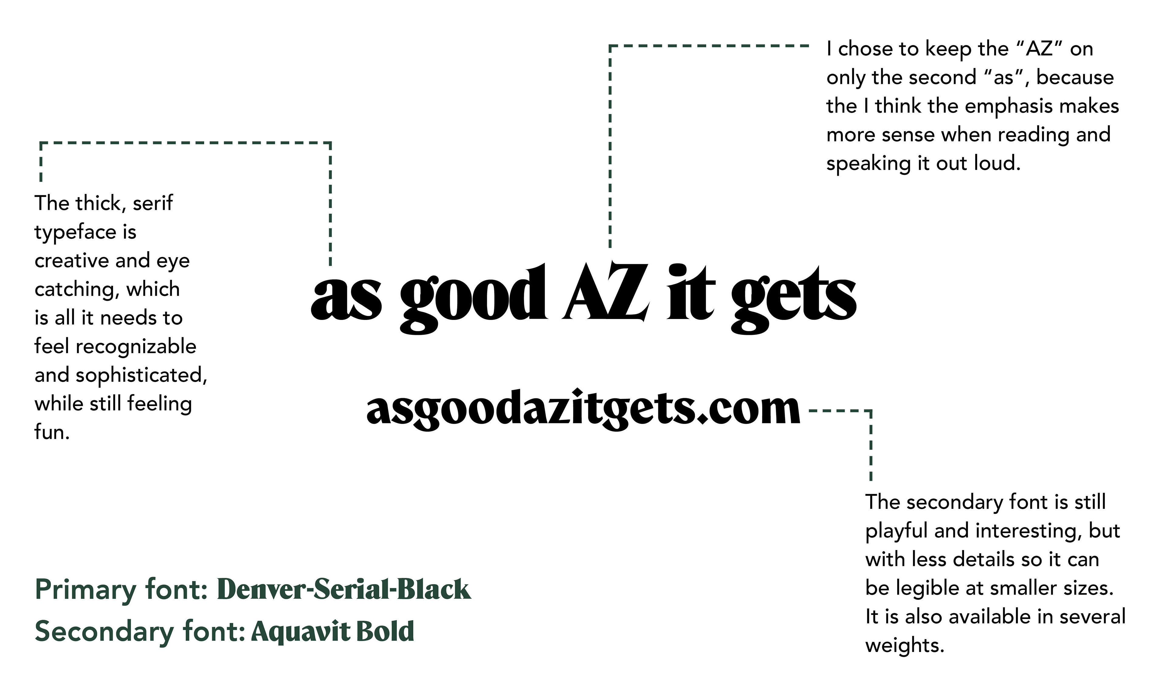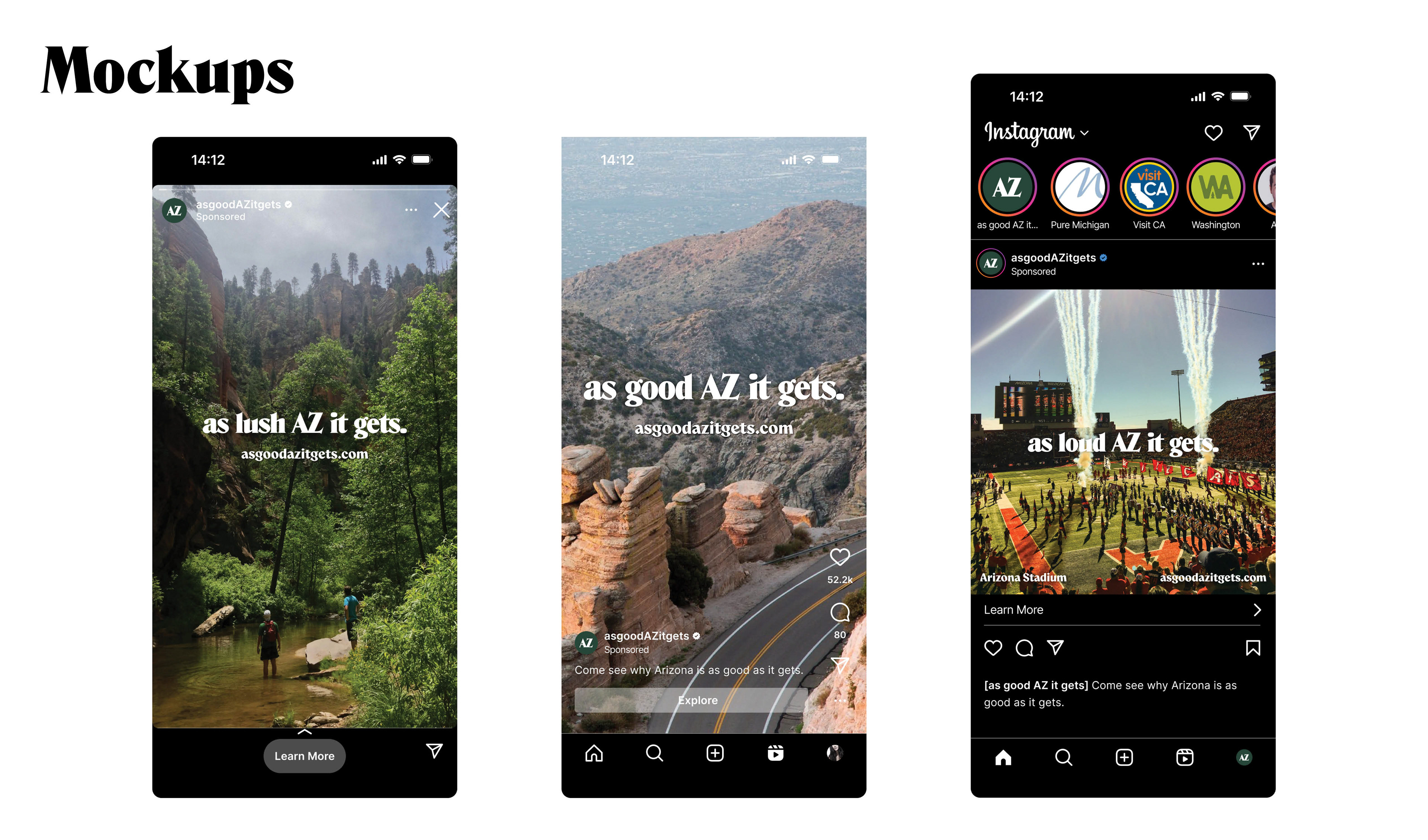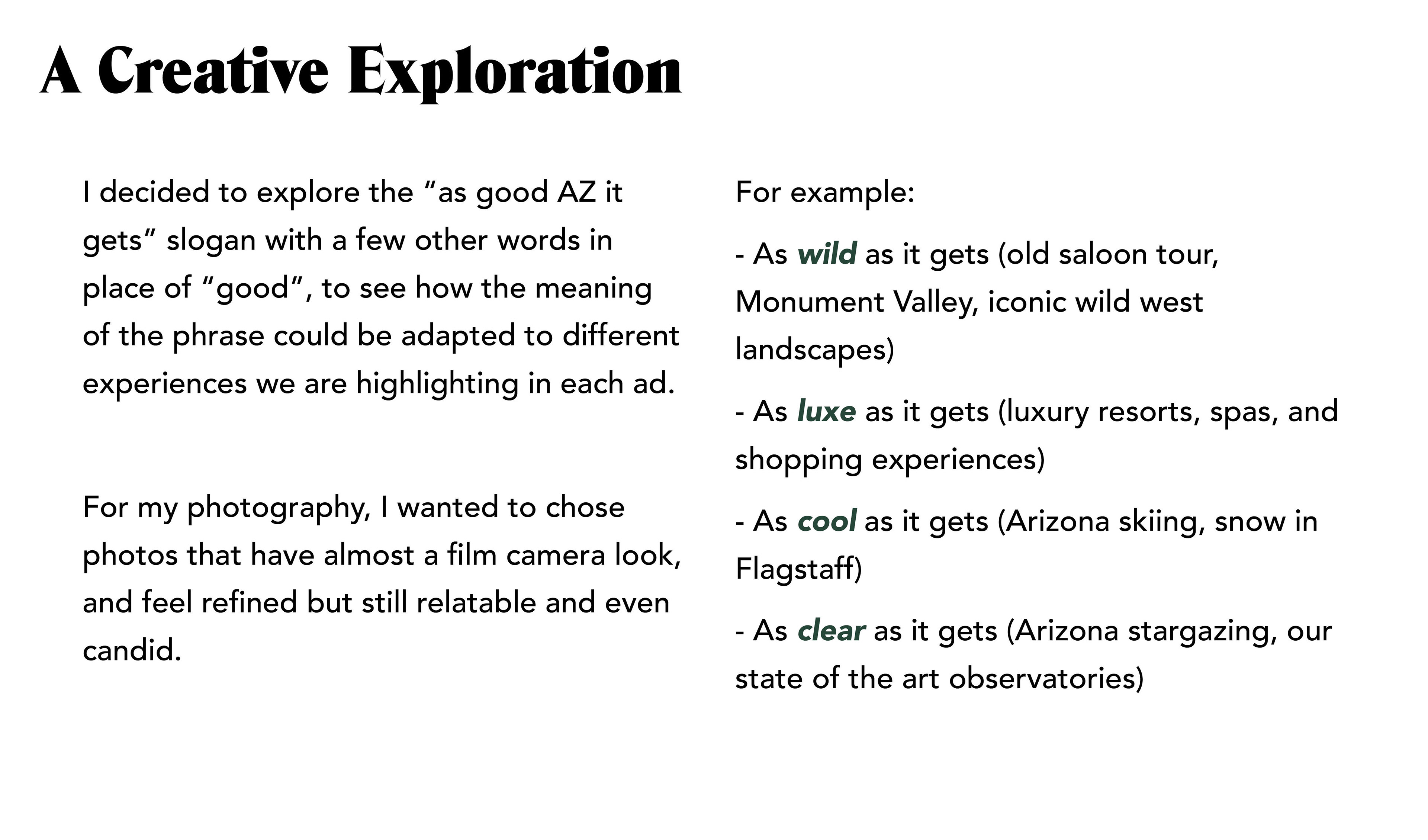 An advertising campaign design to promote tourism to Arizona, using the slogan "As good AZ it gets". I am currently working with this client to continue this design and make it a reality.