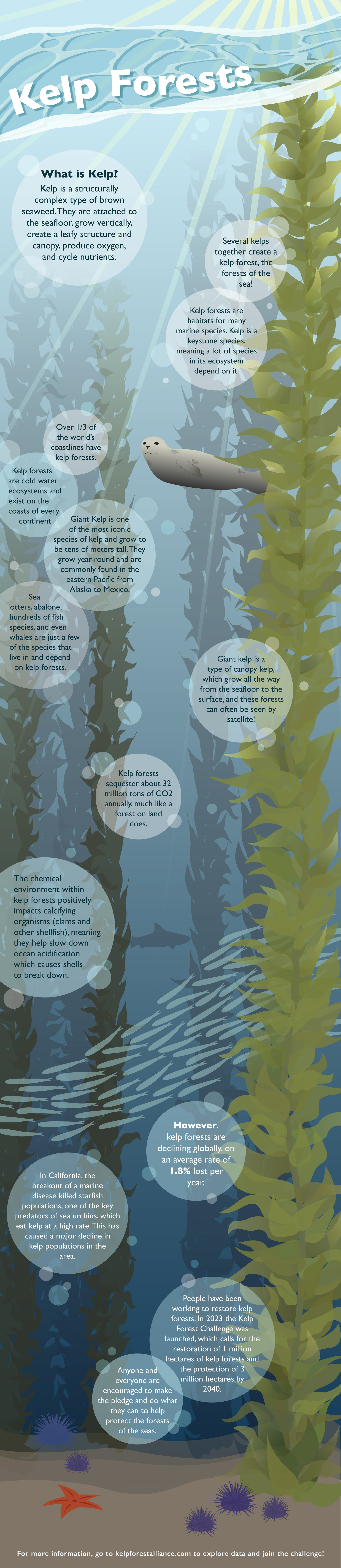 I created this scrolling-style infographic based on data from the Kelp Forest Alliance's "State of the World's Kelp" Report from 2024. All graphics are vector and created in Adobe Illustrator.